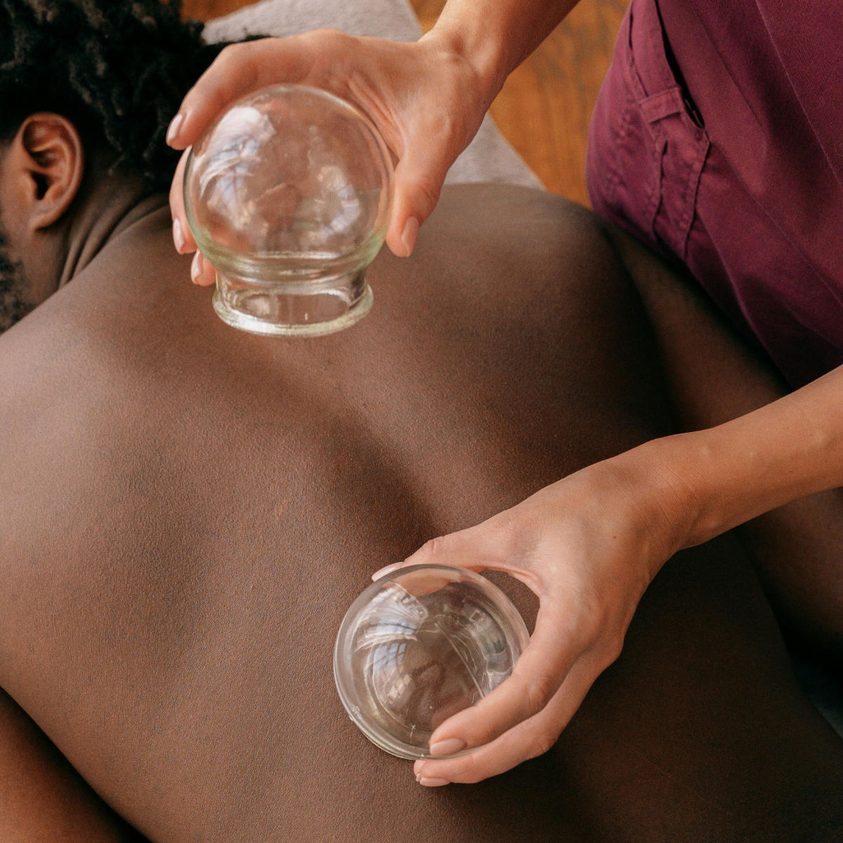 Placement of heated cups on the skin to create suction, which helps improve circulation, relieve muscle tension, and promote healing.